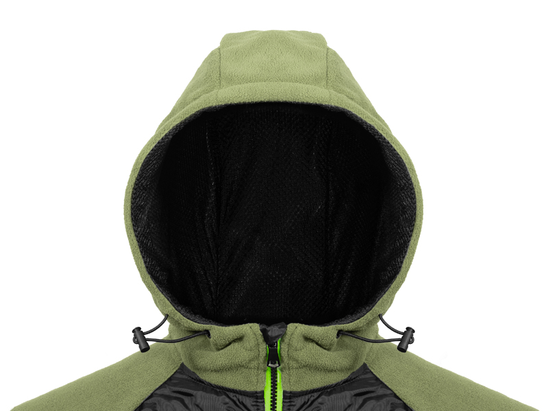 A kabát középső része könnyű, steppelt betétből készült, amely hatékonyan véd a széltől és a hidegtől, míg az ujjak, az oldalsó részek és a kapucni puha fleece anyagból készültek. Ez kellemes tapintást, jó hőérzetet és maximális mozgásszabadságot biztosít még párás, hűvös napokon is. Az állítható kapucni belül légáteresztő hálóval bélelt, ami tovább növeli a kényelmet aktív mozgás közben, és jobb szellőzést biztosít.