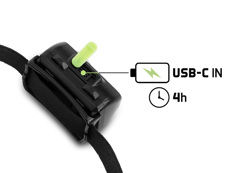 A fejlámpa egy beépített 1200 mAh-s akkumulátorral működik, amely USB-C kábellel tölthető. A teljes feltöltés körülbelül 4 órát vesz igénybe. A lámpán töltöttségjelző is található.