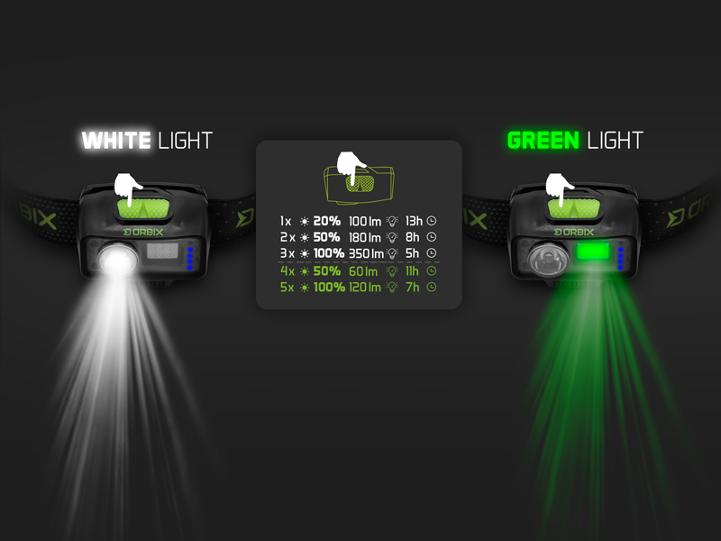 Két LED dióda gondoskodik a világításról, fehér és zöld fény közül választhatunk. Az első gombnyomásra 20%-os (100 lm) fehér fény kapcsol be, amely 13 órán keresztül világít. A második gombnyomás 50%-os fényerőt ad, ez 8 órán át működik. A harmadik gombnyomásra a maximális, 100%-os fényerő (350 lm) kapcsol be, amely 5 órás működési időt biztosít.