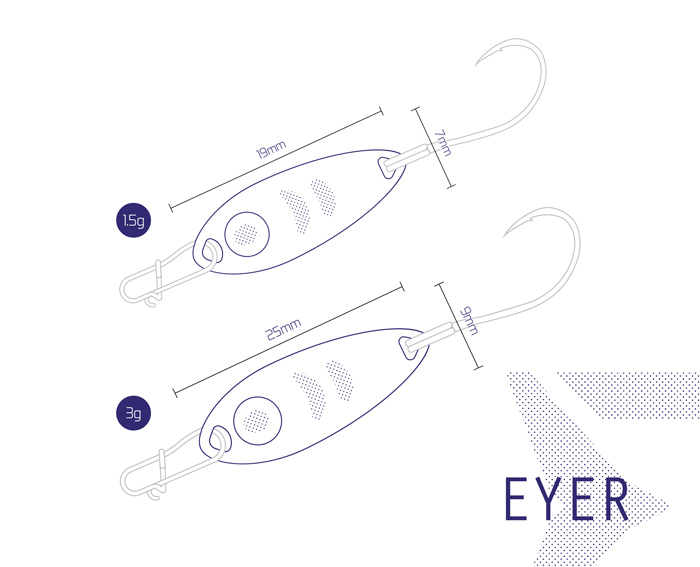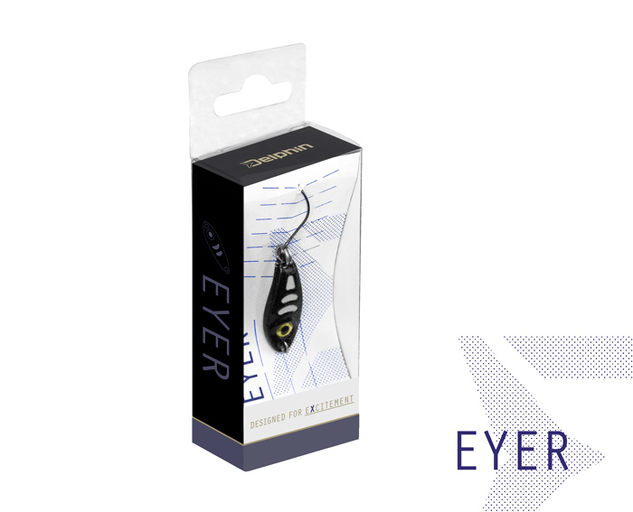 A Delphin EYER villantó termékcsalád ideális műcsali a pisztrángos (Trout Area) horgászterületein. Testük cink ötvözetből készül. Minőségi BOMB! egyeshoroggal vannak felszerelve HardLure szakállal és FASTLOCK MICRO SNAP karabínerrel, hogy nehogy elveszítse fogását. A pisztrángon kívül nem vetik meg a tavakban vagy patakokban még kisebb ragadozó halak sem. Az a tény, hogy nagyon csábítóak a ragadozók számára, már az első pillantásra látható. Az EYER villantók viszonylag nagy műszemmel vannak felszerelve, amely tökéletesen utánozza az élő csalit.